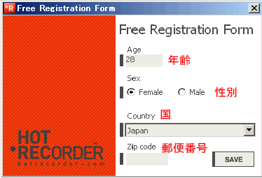 HotRecorderが起動すると、年齢・性別・国・郵便番号を記入する場面がでてきますが、郵便番号は記入しなくてもいいです。